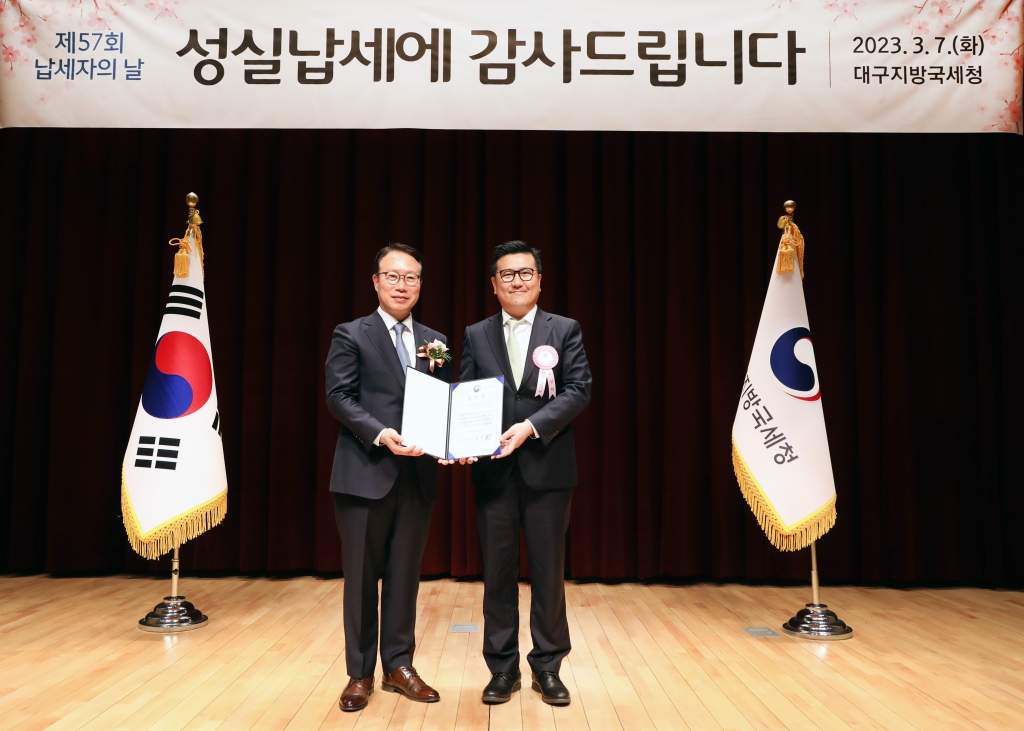 송호진 대표는 지난7일 대구지방국세청이 정부대구지방합동청사에서 개최한 ‘제57회 납세자의 날’ 기념행사에서 기획재정부 장관 표창을 받았다. 대구·경북 지역에서는 이번 ‘납세자의 날’에 기업인 71명이 모범 납세자에 선정됐으며, 성실 납세와 나눔문화를 실천한 2명이 아름다운 납세자로 뽑혔다.