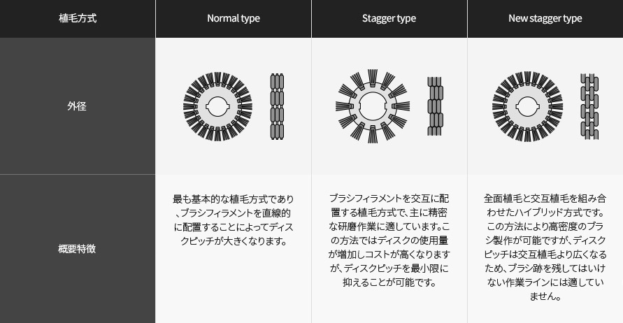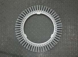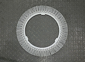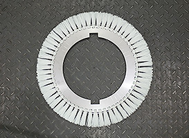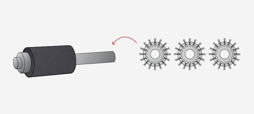 円盤型の鉄板(ディスク)の曲面に穴を開け、その中にブラシフィラメントを充填して製造されるブラシの一形態です。これらのディスクを積層することによって、ブラシロールが作られます。