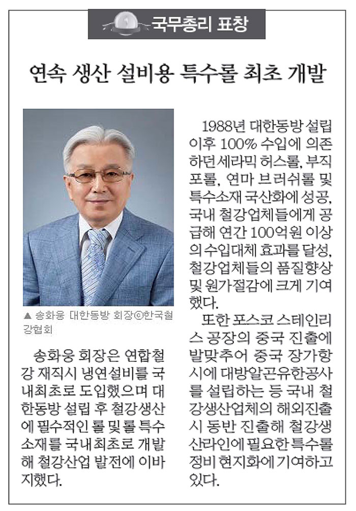 [철강금속신문]철의날 국무총리표창-연속 생산 설비용 특수롤 최초 개발