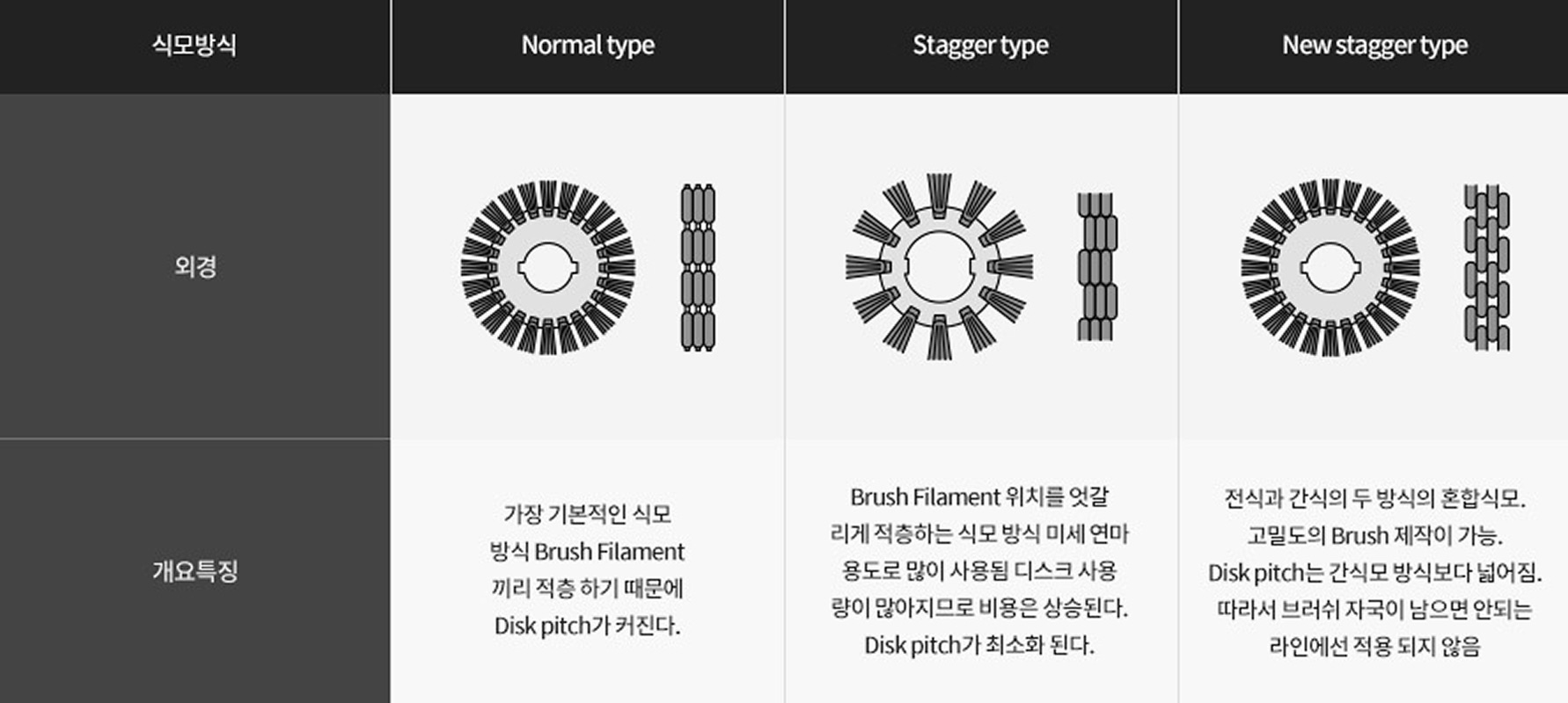 - Brush 실 외경 : Brush 실 외경을 굵게 하면 강력한 연삭에 적합한 Brush 입니다. 반대로, Brush 실 외경을 가늘게 하면 세세한 브러싱 (세척)에 적합한 Brush 입니다. Brush Filament 외경을 굵게 할수록 강력한 연삭에 적합한 Brush가 됩니다. 반대로, Brush Filament 외경을 가늘게 하면, 세밀한 Brushing(세정)에 적합한 Brush가 됩니다.