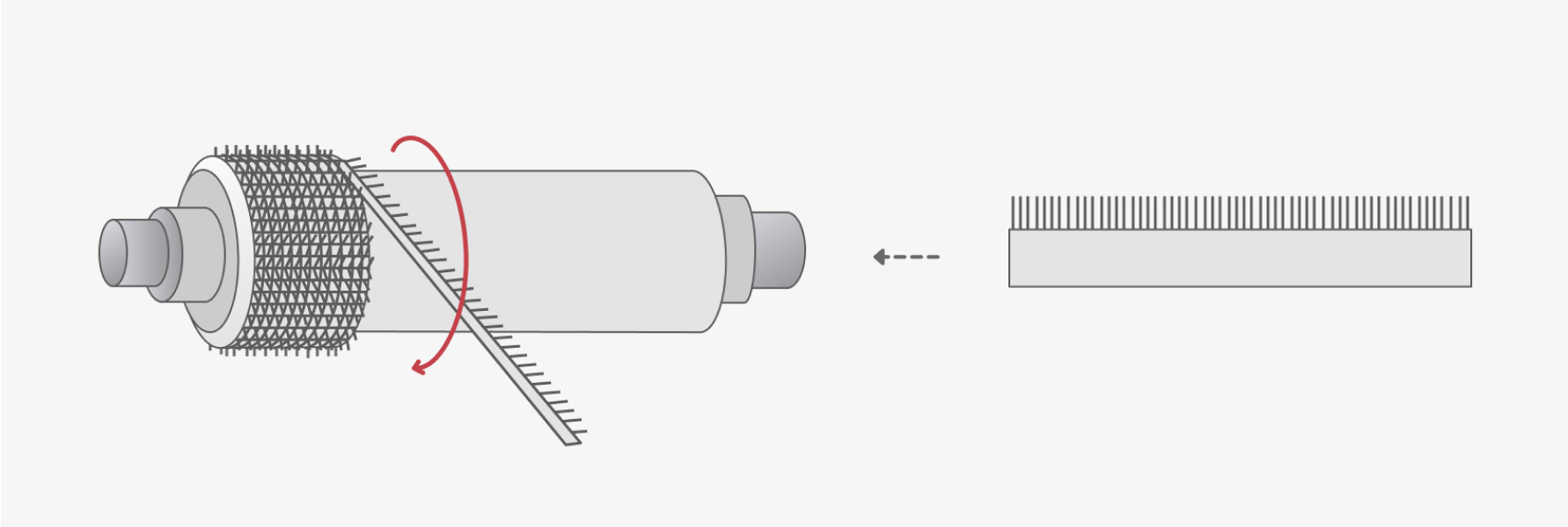 DISK TYPE BRUSH 형태로 제작하나 ROLL SHAFT에 적층하지 않고 필요 사이즈에 따라 일정한 길이의 블록 형태로 만들어 공급합니다. 그리고 최종 사용 고객이 ROLL SHAFT에 단순 조립하여 사용합니다.