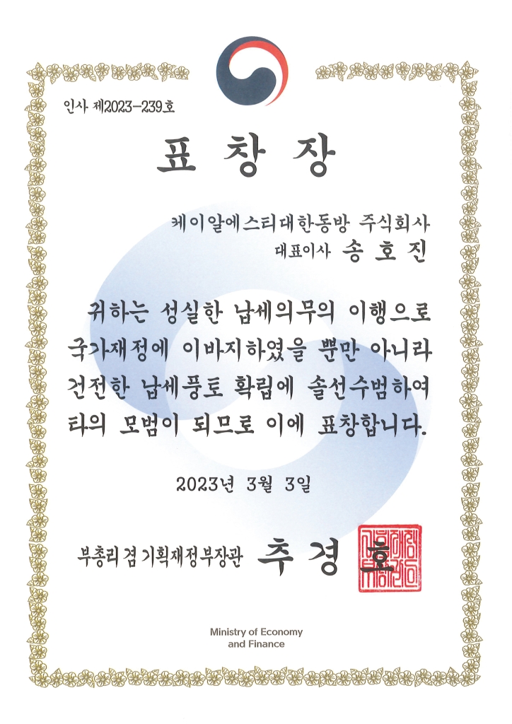 KRST대한동방 송호진 대표가 지역발전·고용 창출·세수 증대에 기여한 공로를 인정받아 ‘제57회 납세자의 날’ 기념 행사에서 기획재정부장관 표창을 수상하였다.